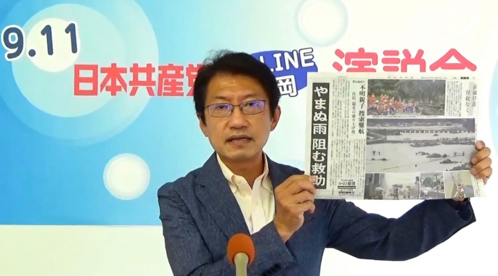 田村貴昭衆院議員は、8月の大雨で2700戸超が被災した福岡県久留米市が被災者生活再建支援法の適用外になっていると述べ、対象の拡大に決意表明。原発優先の出力制御や、太陽光発電の乱開発、福岡空港の米軍の土壌汚染について「地域の国政課題と向き合い切実な要求の解決にがんばる」と語りました。(動画はコチラ)